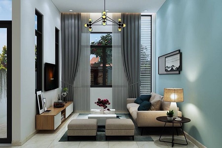 Phần cửa sổ lớn phía trước và cửa sổ bên hông giúp mở rộng diện tích sử dụng cho căn phòng. Do chiều rộng căn nhà khá nhỏ, HD Design khi nhận thiết kế 3D nội thất phải tính toán các chi tiết nhằm khắc phục nhược điểm này, phần tường sơn 2 tông màu xanh – trắng tạo cảm giác tăng diện tích sử dụng.