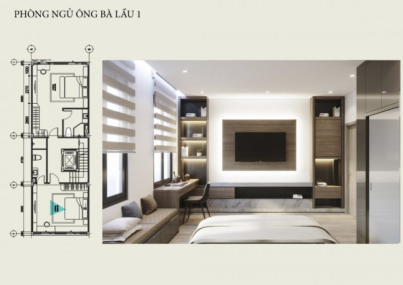Trong phòng ngủ người lớn có đầy đủ nội thất như tivi, bàn làm việc, tủ đồ, ghế ngồi… mọi thứ được thiết kế tối giản hiện đại, gọn gàng.