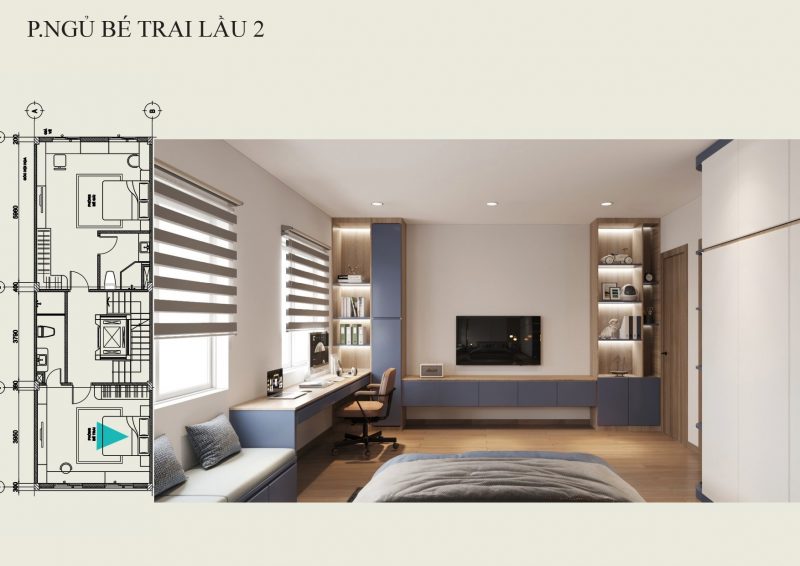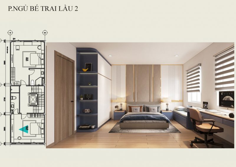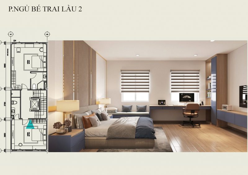 Phòng ngủ bé trai được thiết kế gam màu xanh dương kết hợp màu nâu vừa sang trọng hiện đại vừa tạo được phong cách cho bé trai.