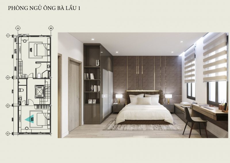 Phòng ngủ ông bà được thiết kế gam màu tương tự phòng khách, vừa sang trọng vừa ấm cúng.